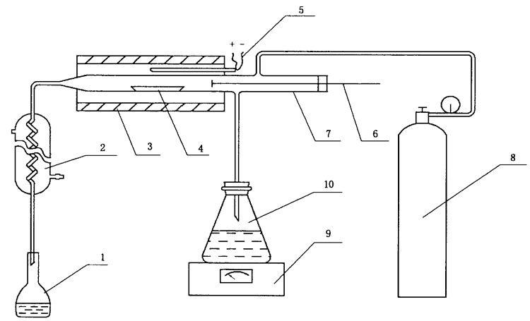 1-容量瓶;2-冷凝管;3-高溫爐;4-瓷舟;5-鉑銠一鉑熱電偶;6-進(jìn)樣推棒;7-燃燒管;8-氧氣鋼瓶;9-調(diào)溫電爐;10 -平底磨口燒瓶。 按圖所示裝配好全套儀器,連接好電路、氣路和水路各個(gè)系統(tǒng),將高溫爐升溫到1100℃。往燒瓶中加入約300 mL水并加熱至沸騰,冷凝管通入冷水。塞緊進(jìn)樣推棒硅膠塞,在平底燒瓶中水沸騰之前通人氧氣,調(diào)節(jié)氧氣流量為400 mL/min,檢查系統(tǒng)不漏氣后,通入水蒸氣和氧氣空蒸15 min。 操作試驗(yàn)步驟 稱取(0.50±0.01)g 一般分析試驗(yàn)煤樣(稱準(zhǔn)至0.1 mg)和0.5 g石英砂放在瓷舟里小心混合均勻,再用約0.5 g石英砂鋪蓋在上面。將100 mL容量瓶放在冷凝管下端接收冷凝液。取下進(jìn)樣推桿,把瓷舟放入燃燒管內(nèi),插入進(jìn)樣推桿,塞緊硅膠塞。將瓷舟的前端推到預(yù)先測(cè)好的約300℃區(qū)域停留5 分鐘,接著推進(jìn)到約600℃區(qū)停留5分鐘,再推進(jìn)到約900℃區(qū)停留5分鐘,最后把瓷舟推到1100℃的恒溫區(qū),拔出進(jìn)樣推桿以免融化,樣品在恒溫區(qū)繼續(xù)燃燒分解15分鐘。在整個(gè)操作過(guò)程中,調(diào)節(jié)燒杯內(nèi)水的蒸發(fā)量,水解開(kāi)始15分鐘內(nèi),容量瓶中每分鐘收集約3mL,后15分鐘,每分鐘收集約2.5 mL,最后總體積應(yīng)控制在85 mL以內(nèi)。燃燒-水解完成后,移走容量瓶。停止通氧氣,取下送樣推棒,取出燃燒舟。 測(cè)量電位 在100 mL燒杯中加入一定量的水,連接好電位測(cè)量裝置,開(kāi)動(dòng)攪拌器,更換燒杯中水?dāng)?shù)次,直至毫伏計(jì)顯示的電位值達(dá)到氟電極的空白電位。 在5個(gè)用水沖洗過(guò)的100 mL容量瓶中,分別加入100 ug/mL的氟標(biāo)準(zhǔn)工作溶液1 mL,3 mL,5mL,7 mL,10 mL,加入3滴溴甲酚綠指示劑,10 mL總離子強(qiáng)度調(diào)節(jié)緩沖溶液,用水稀釋到刻度,搖勻,靜置30分鐘。 計(jì)算結(jié)果: 煤中氟的含量(Fad)按下面公式)計(jì)算,測(cè)定結(jié)果修約到個(gè)位。